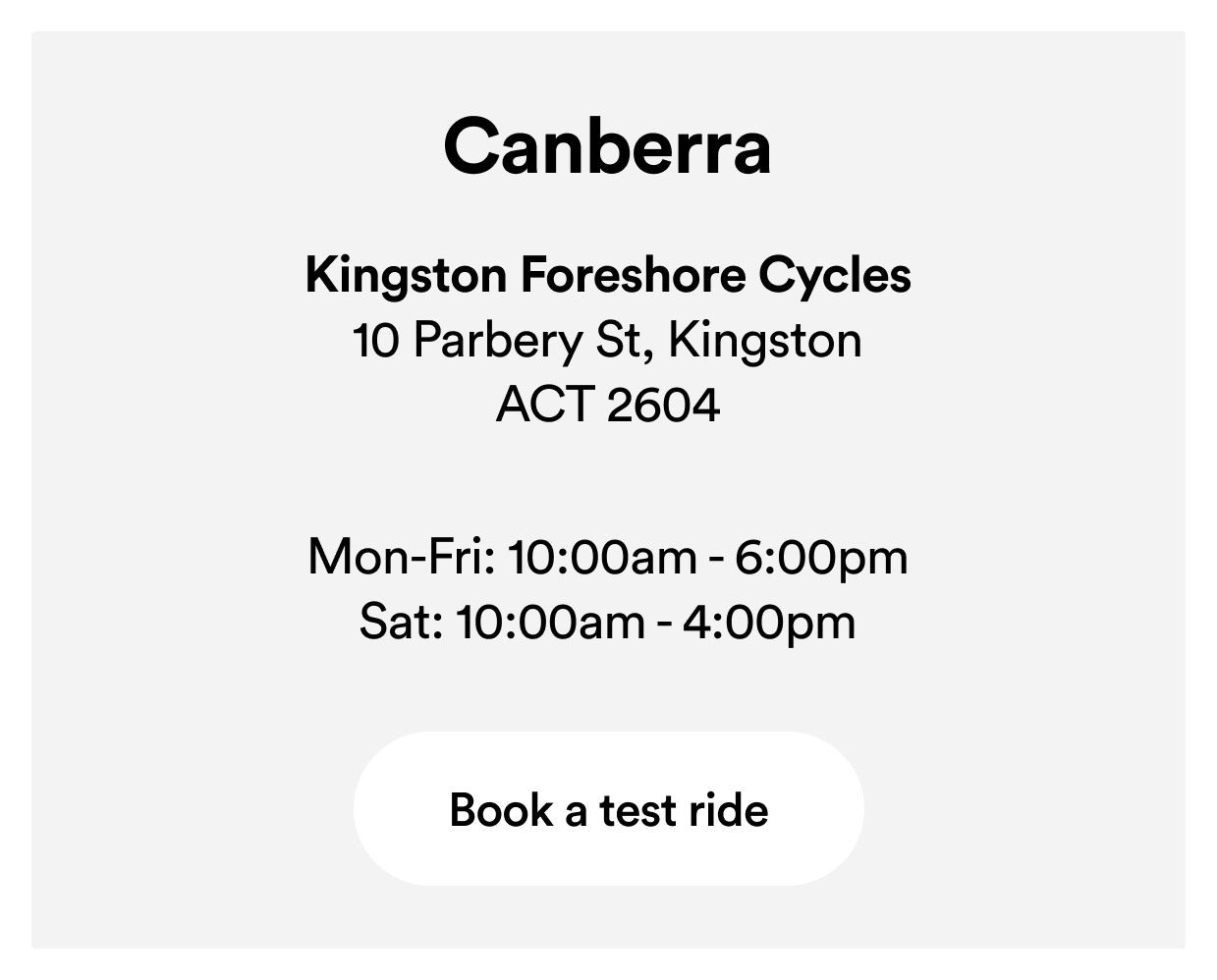 - Test rides can be booked directly at our website for Melbourne and Kingston Foreshore Cycles in Canberra - click the button to view available slots. An expert will be there to welcome you, adjust the saddle, and guide you through your ride. For test rides at other Partner locations, please visit their website to check availability and arrange your ride directly. See you soon for a smooth ride!
