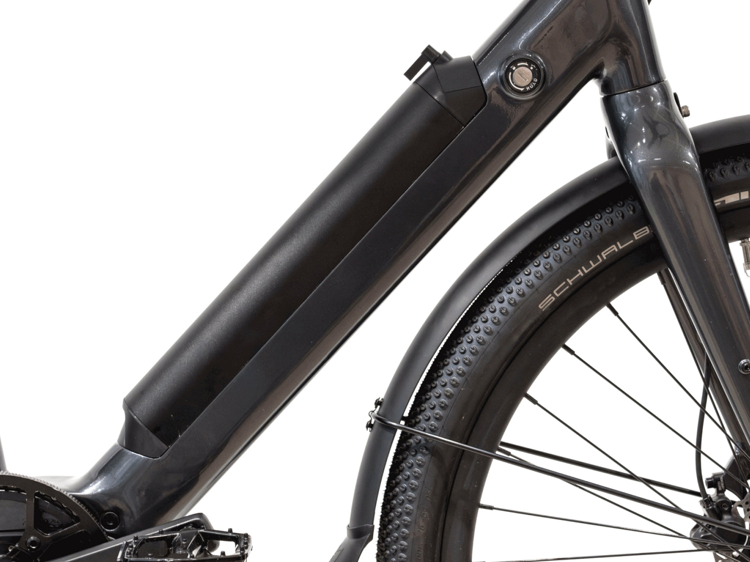 A battery thats easily removable and integrated with the frame of the bike. Choose from two batteries, ride up to 100 km on a single charge. Take it off, take it indoors, charge it up, head off. Beautifully simple. Easy to replace, easy to upg
