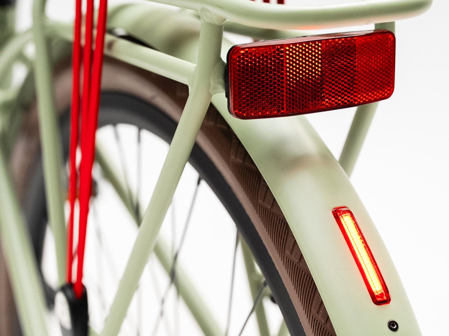 Illuminate your path in style with the Jordaan eBike, boasting premium lighting features. The front light is powered by Spanninga® XO with Philips® optical system. Integrated in the rear fender the Buechell® Nano COB LED Technology providing exceptional visibility from behind and activates when you pedal backward. These cutting-edge lighting solutions make every ride safer and more enjoyable, giving you confidence in any traffic situation.